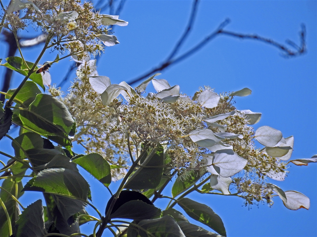 ←枝先の花の周囲の装飾花は白の萼片で葉脈がある 花は雄蕊10本雌蕊1本 鋸歯葉