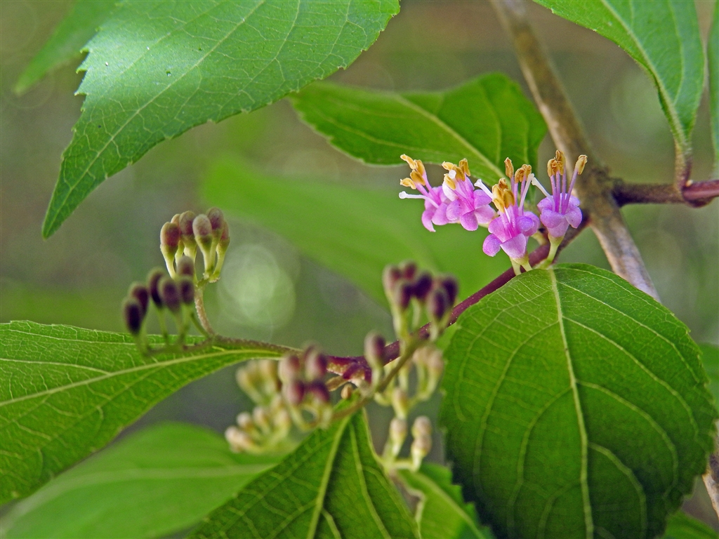 コムラサキ(小紫)の花も、先週の藪紫に続いて咲き出した。御本家の紫式部はまだ蕾