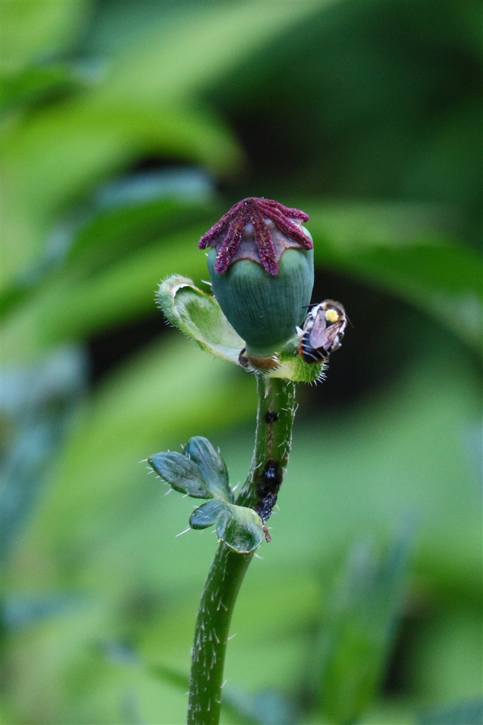 この蜂、背中に黄色いもの背負ってます。花粉か知ら?