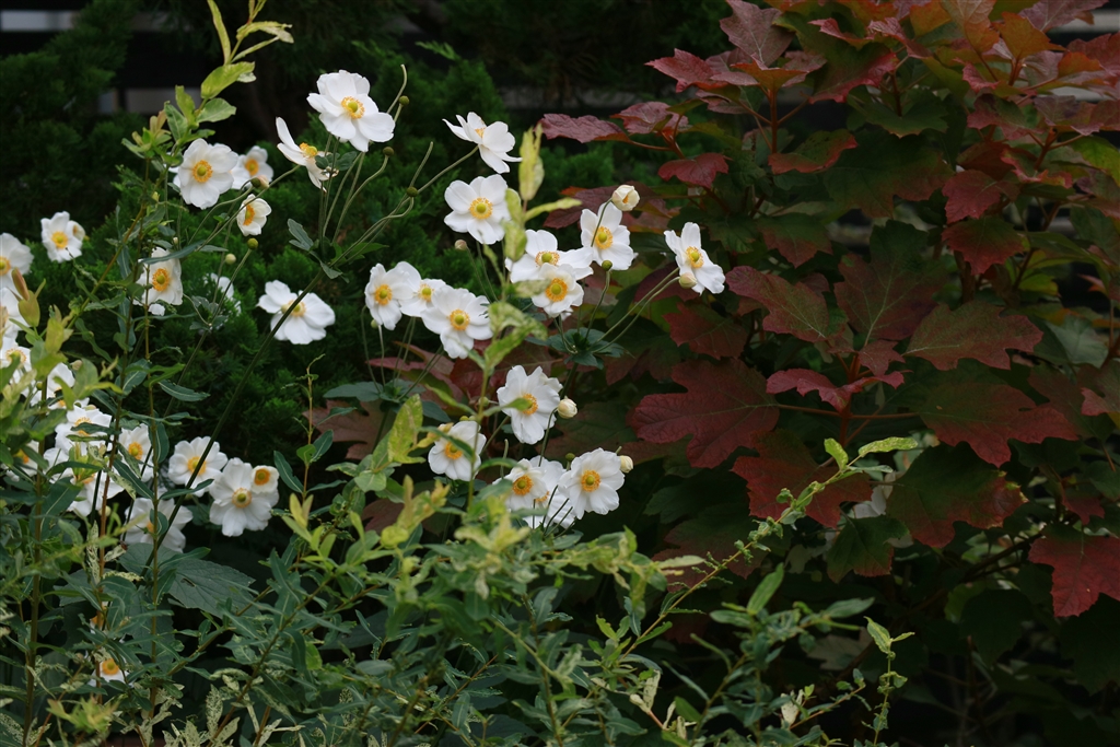 秋明菊もピークアウト。後ろのカシワバアジサイの葉っぱも紅くなって来ました。
