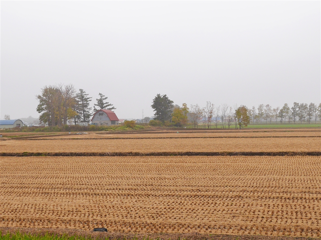 車の窓越しに撮った新篠津村の景色です。温度差があった日で、ちょっとモヤってます