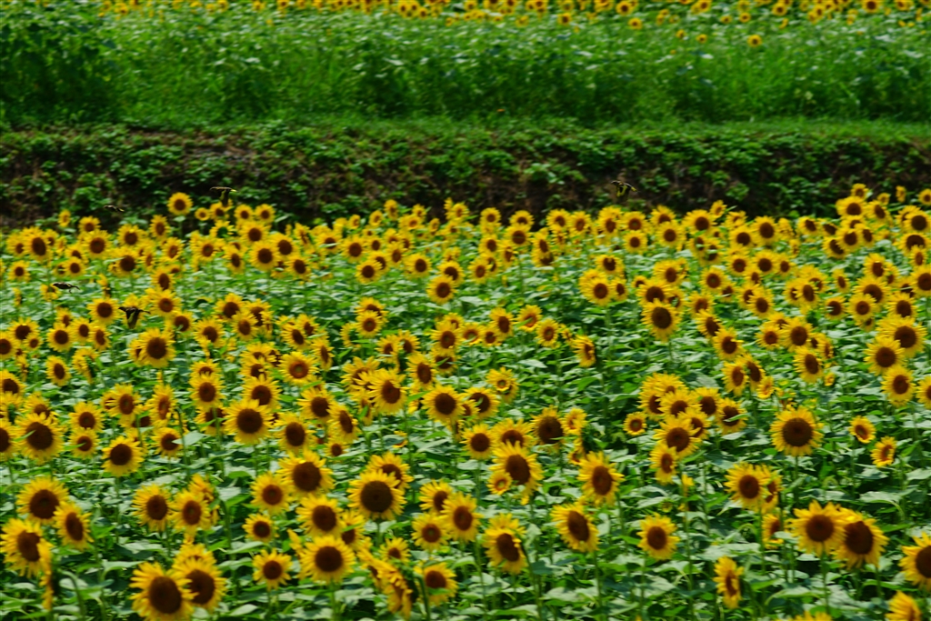 ヒマワリと 多分 カワラヒワ連射中の4コマ
