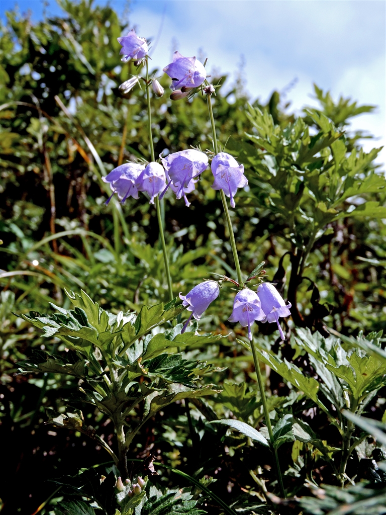 ツリガネニンジン(釣鐘人参) 茎頂の円錐形の花序に1個〜数個が輪生し下向きに咲く