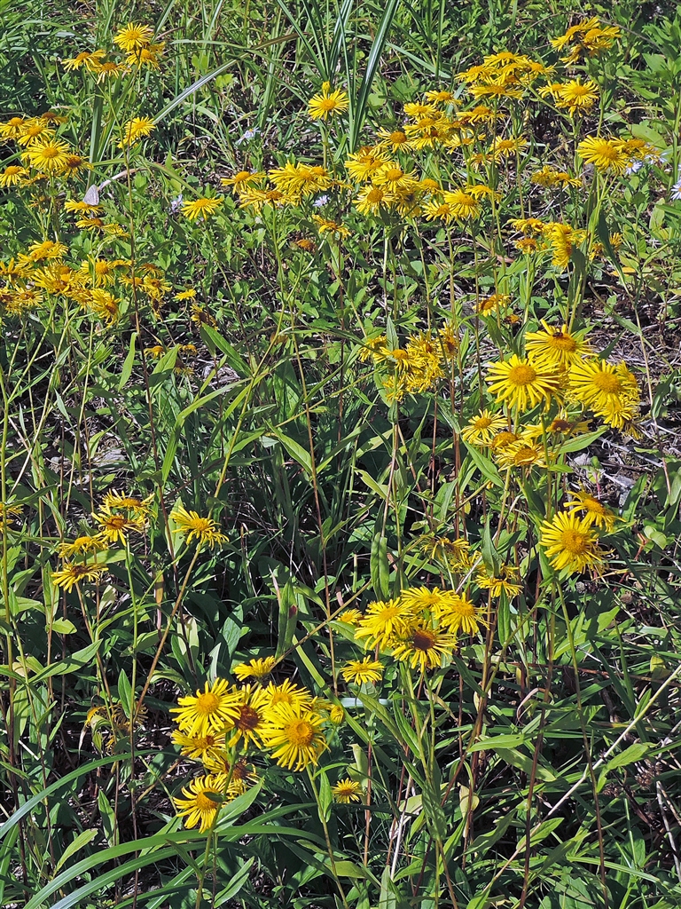 オグルマ(御車) 湿った草原に生育。放射状に並んだ黄色花を金の小車=牛車に見立てた