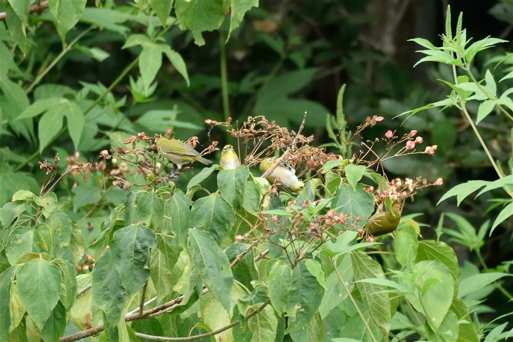 メジロが群れをなして木の実を啄んでいました (4枚いずれもクロップ)