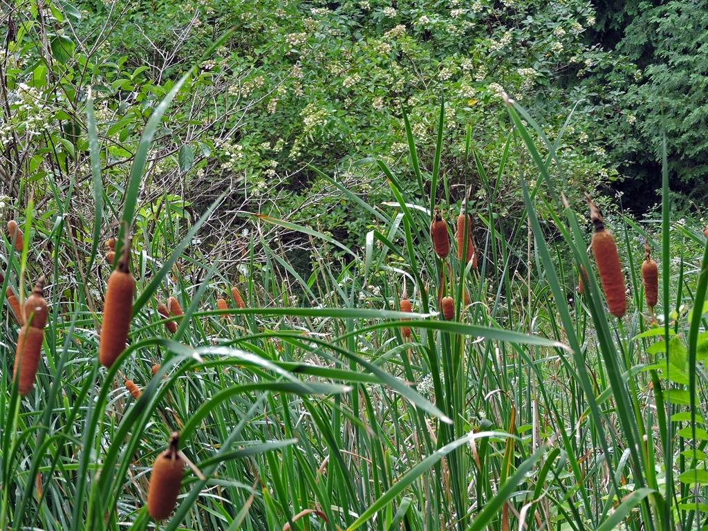 ガマ(蒲)の穂 湿地で抽水し地下茎で生育。夏に茎から円柱形の穂。花は穂先に突き出る