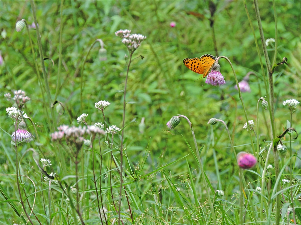キセルアザミ(煙管薊) 本州&四国のみの日本固有種。花が下向き=煙管状。蝶は緑豹紋