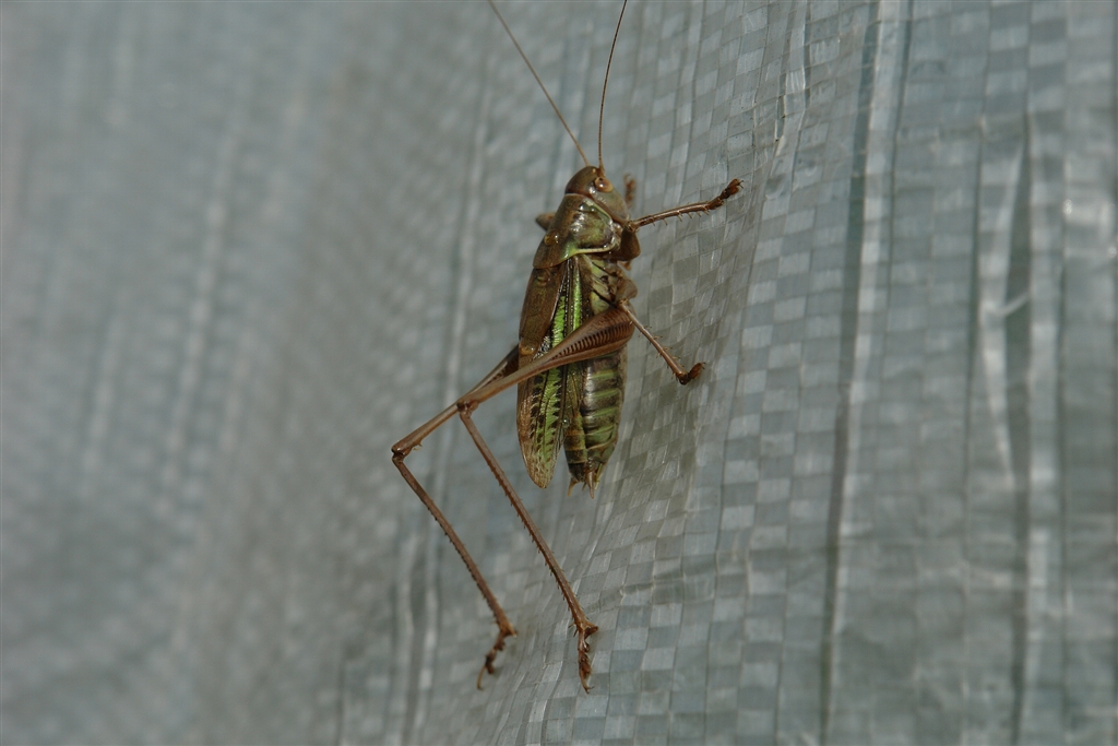 キリギリスの後ろの透過性の悪いビニールハウスはトマトも残念・・・「くる禁」