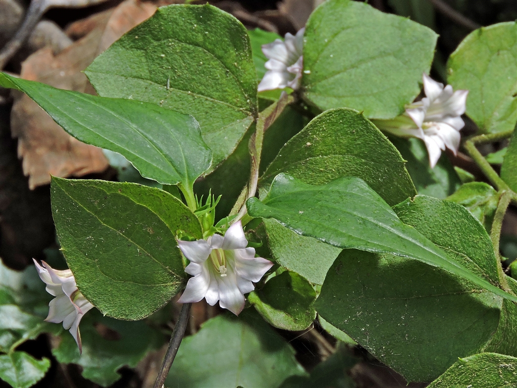 ツルリンドウ(蔓竜胆)が例年より半月程早く咲いていた。晩秋に赤い実が花弁先に出来る
