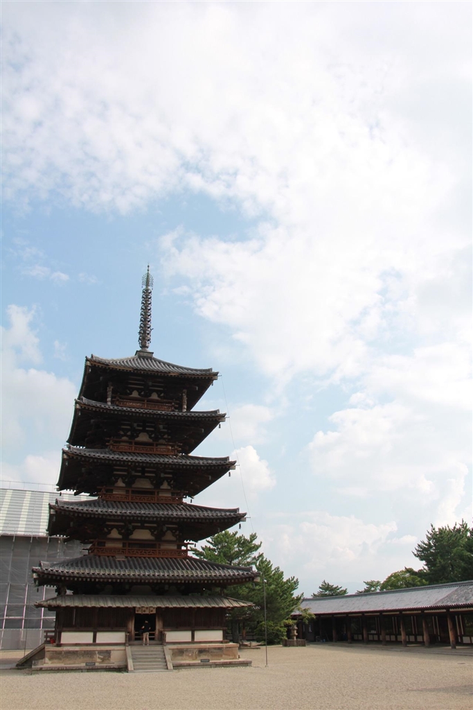 法隆寺は中門修復工事中でした(後ろに見える足場)