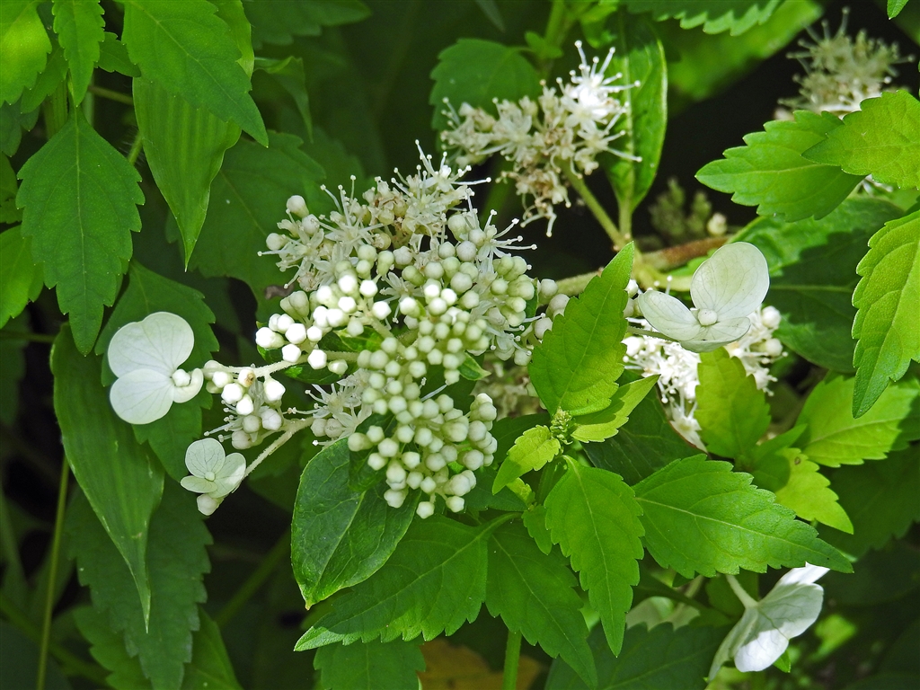 ガクウツギ(額空木) アジサイ属、萼片の白装飾花と小さな両性花。初夏の花なのに何故?
