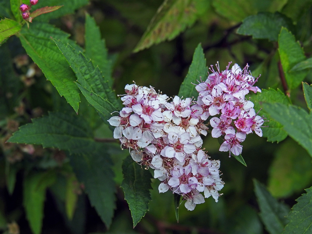 シモツケ(下野) 落葉低木。高さ約1m。下野国・栃木で日本初発見。花色は変異が多い