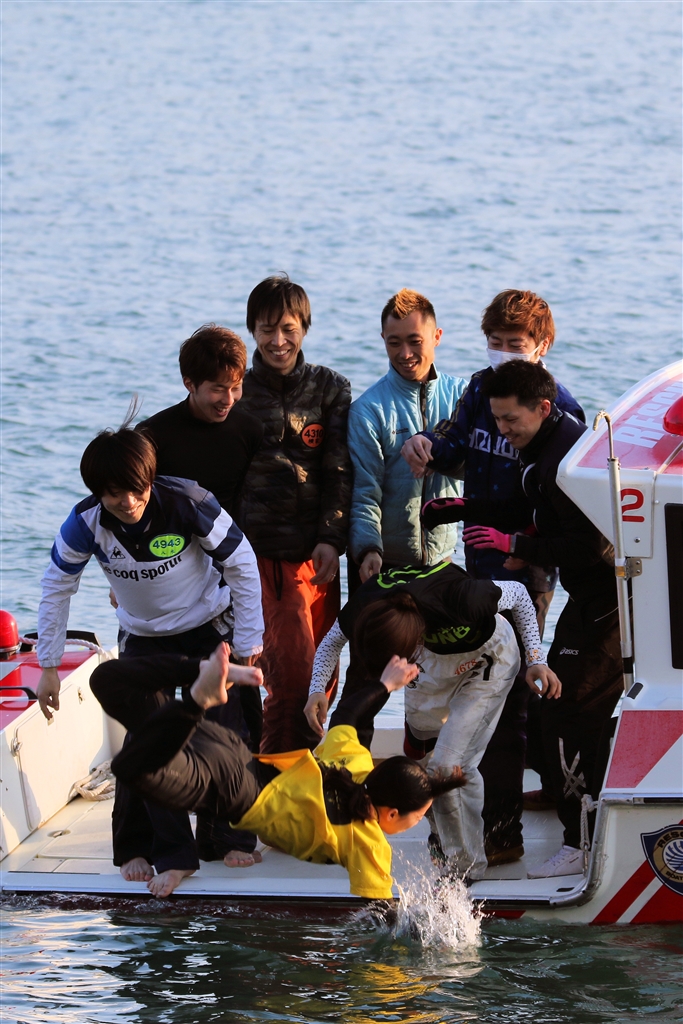 水中に放り込まれる水神祭 先輩をつかんで引きずり込んでます。