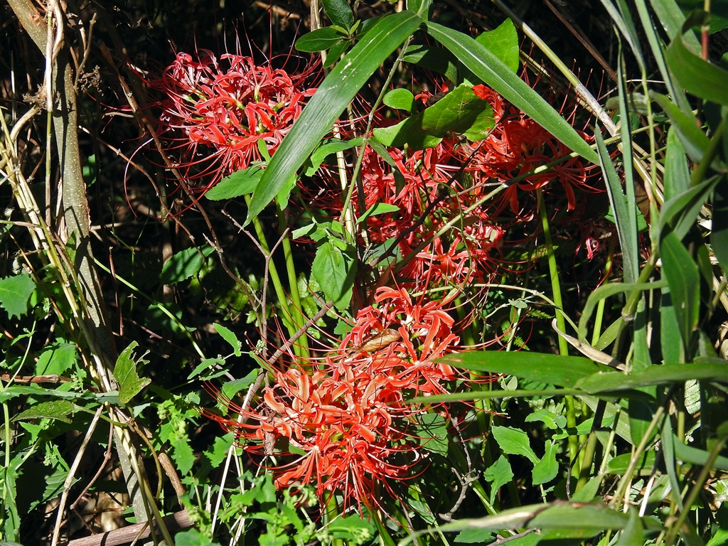 ブッシュに埋れるように咲く彼岸花。可哀そうに全く目立たず見る人も私だけかも・・