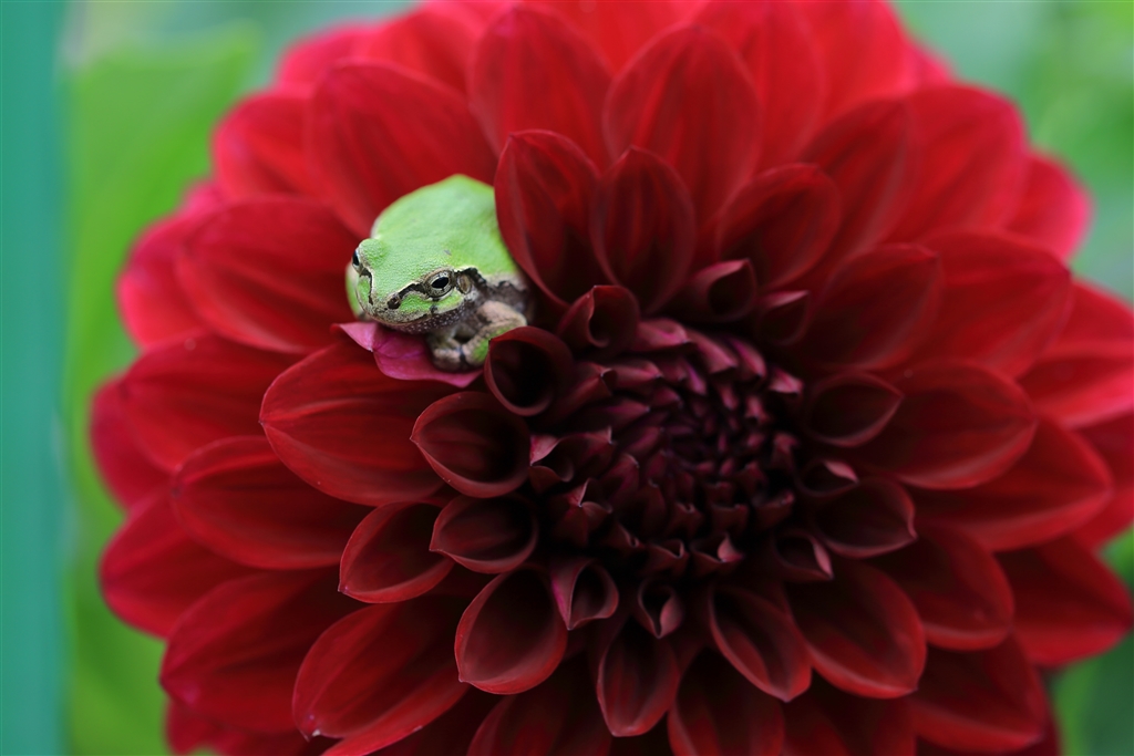 「そこに居るのはダリア」 アマガエルとダリア