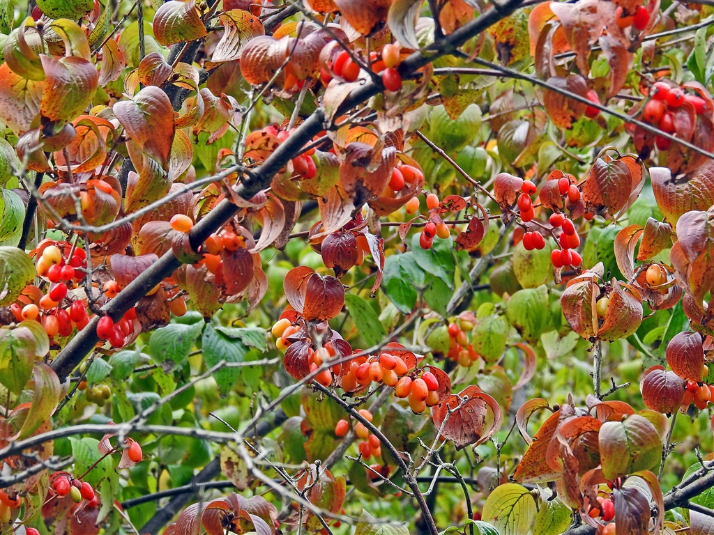 色付きだしたサンシュユの葉と実 もう少ししたらで鳥が啄ばみに来るだろう。