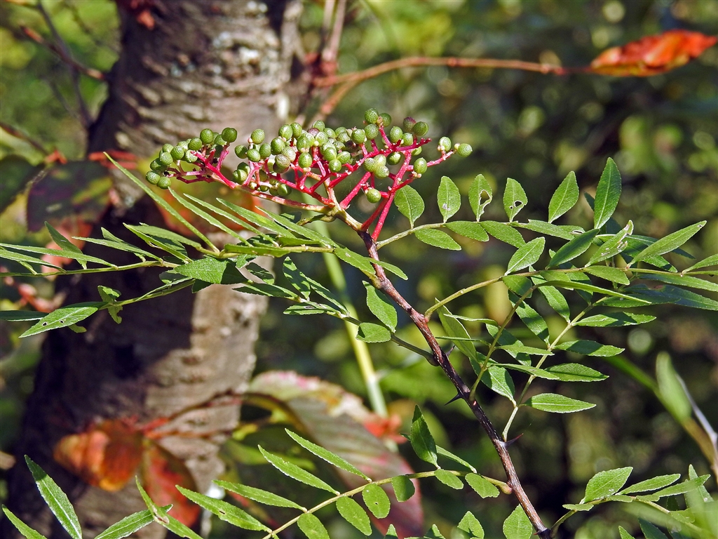 イヌザンショウ(犬山椒) 薄緑の実→赤→褐色→3分割→黒い実3個。山椒と同じ棘あり