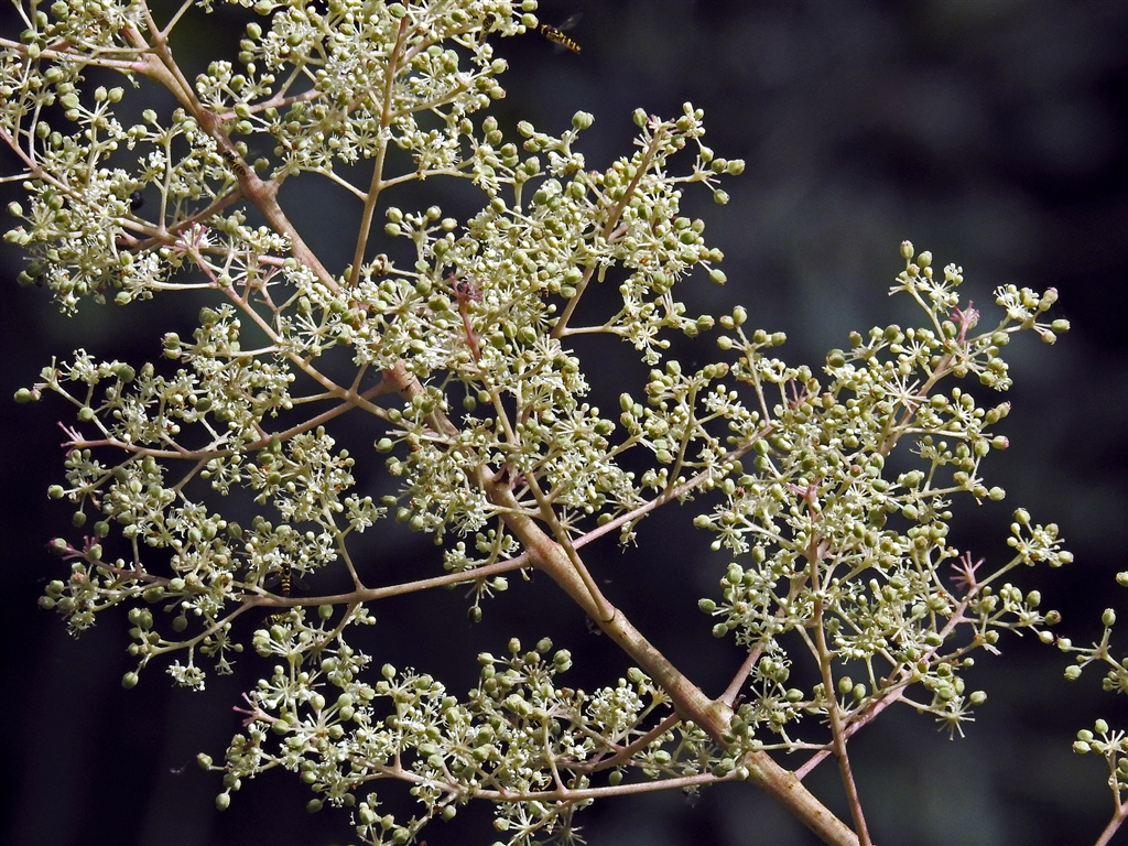 タラノキ(メンダラ)の蕾と花 棘が有るのをオンダラと呼ぶ。この木はまだ蕾と花だけだ