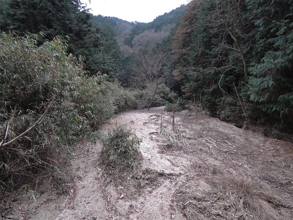 水流が消えた沢。上流のアチコチが崖崩れで土砂が下流域を埋めてしまった。