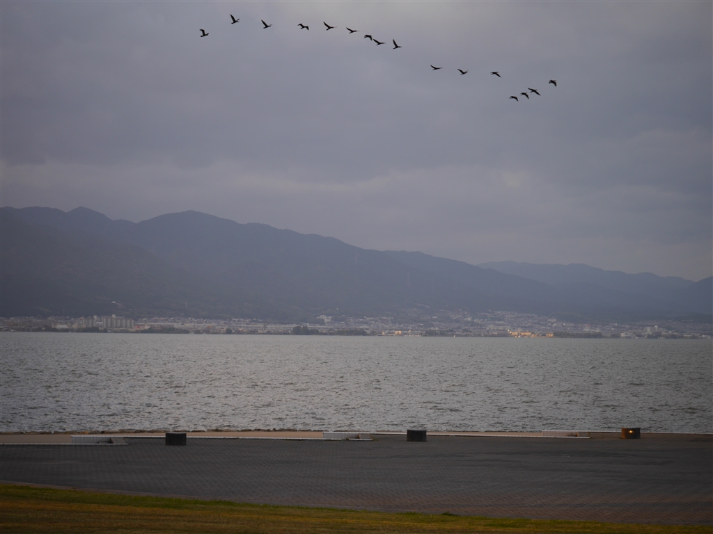 夕暮れ時の湖岸。