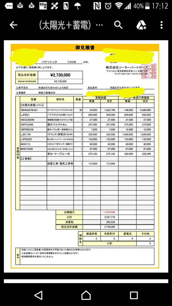 『見積もり』 太陽光発電 購入相談 nakmorさんのクチコミ掲示板画像1/1