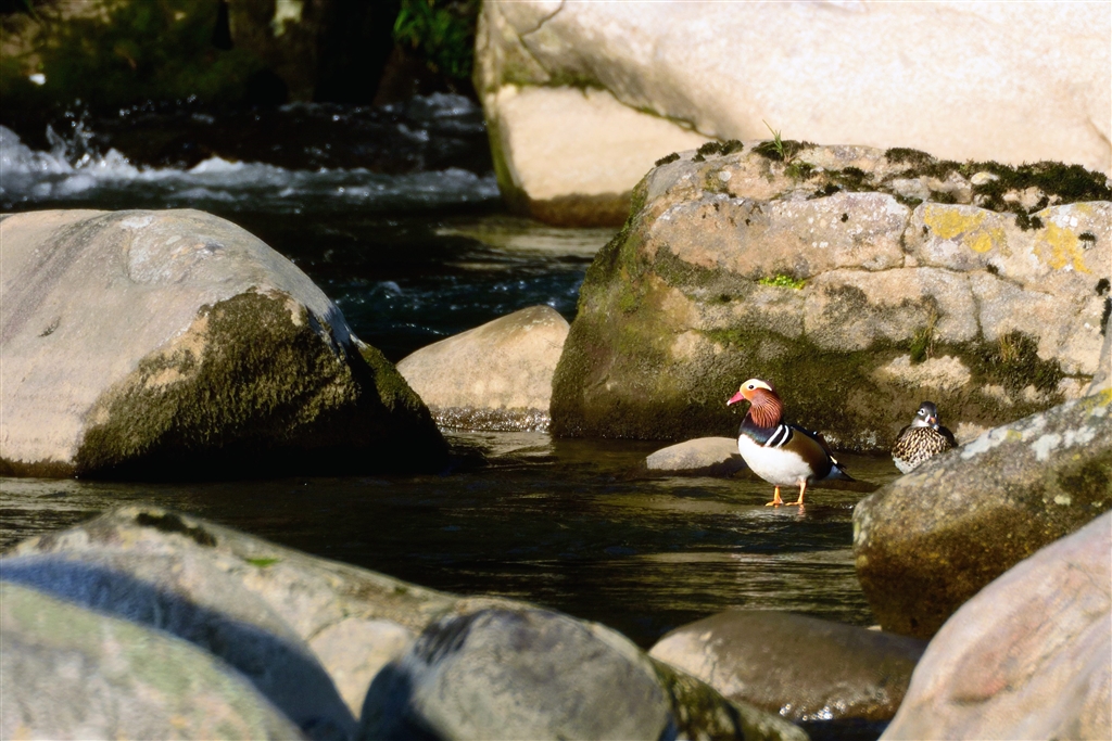 遠くの岩場で日向ぼっこのオシドリ番い