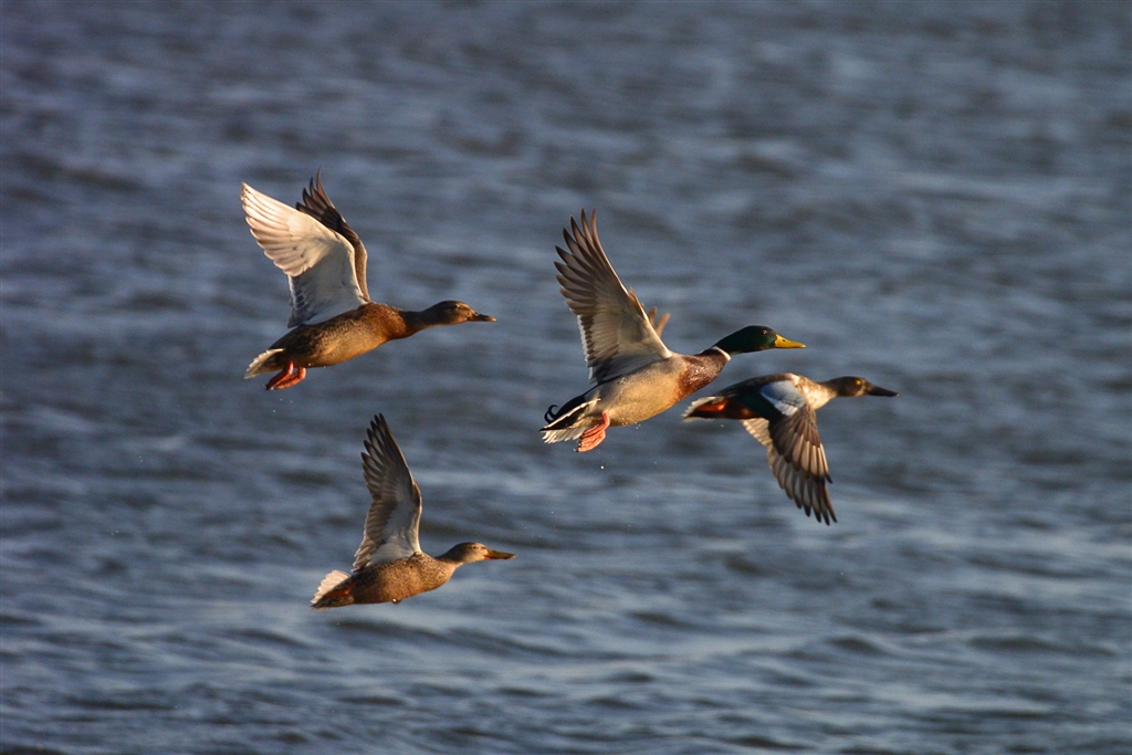 マガモとハシビロガモ 夕日を浴びて