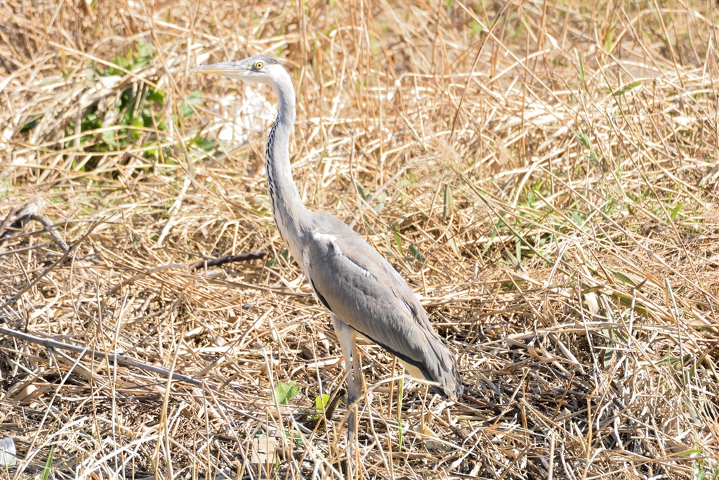 真昼の日差しの葦群の中のアオサギ