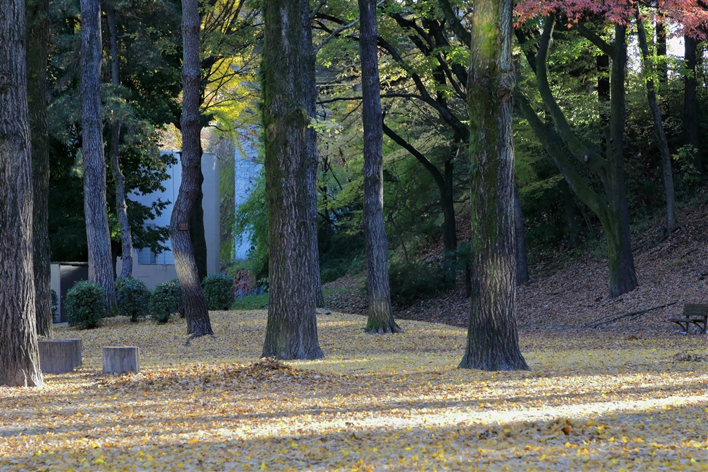 朝日が強く、イチョウの絨毯が白く光ってしまいました。