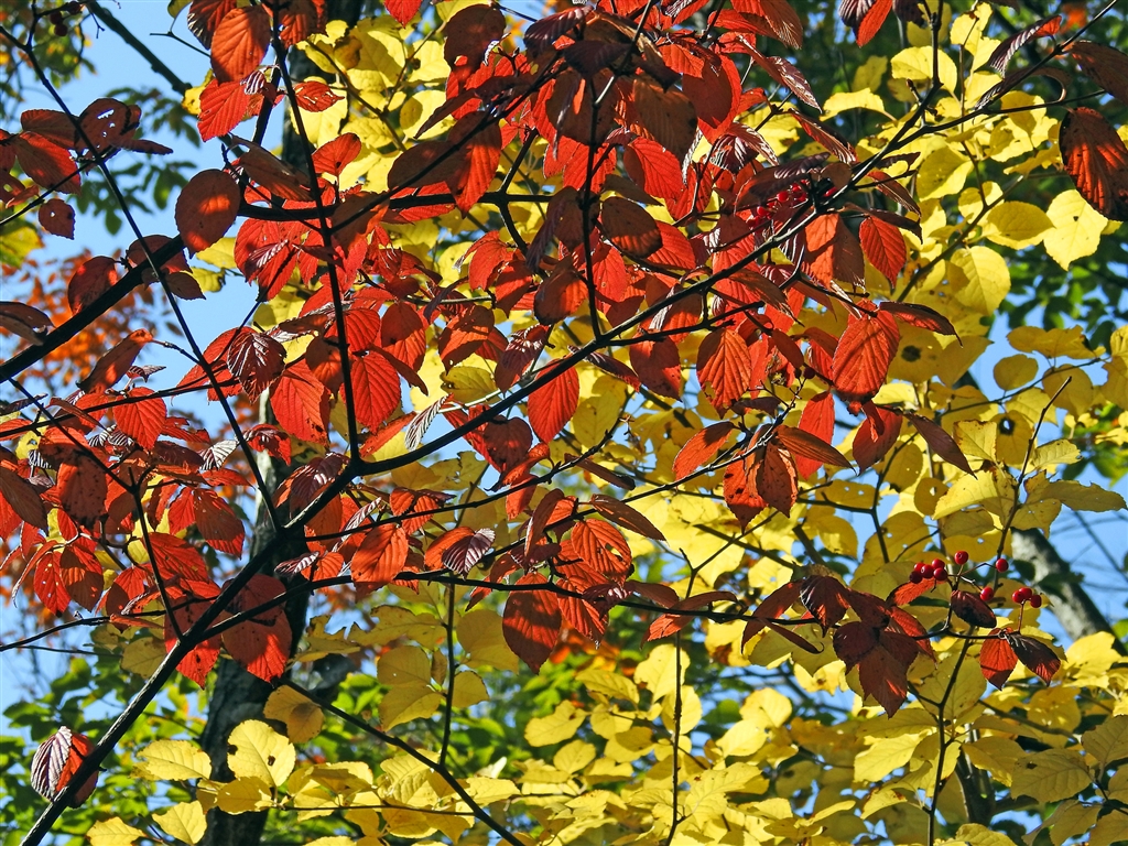 コバノガマズミの紅葉とタカノツメの黄葉と青い空の三重奏。