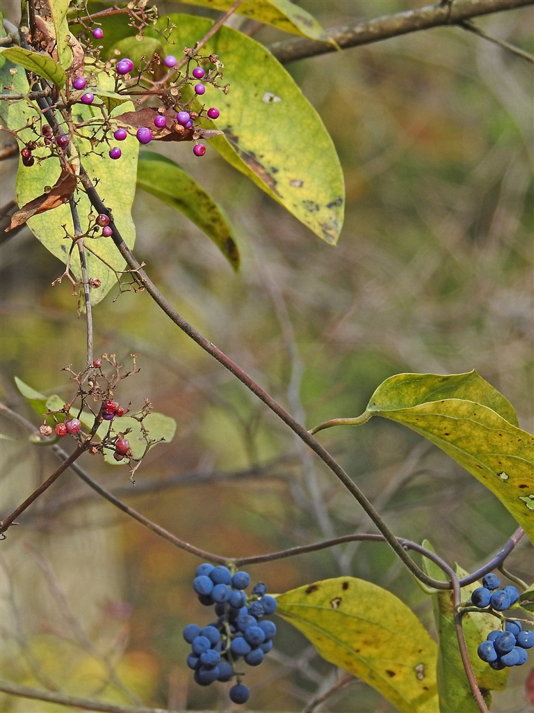 上に最盛期を終えた紫式部の実、下に今が盛りのアオツヅラフジ(青葛藤)の実のコラボ