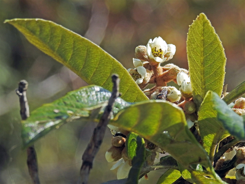 ビワ(枇杷)の花、咲き出す。名の謂れは葉の形が和楽器の琵琶(びわ)に似ている所から