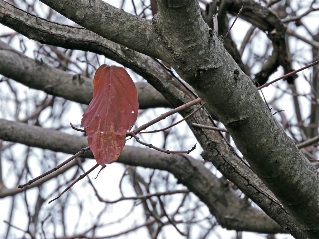 おっとドッコイ、1枚だけ残ったクマノミズキの紅葉。これは撮ってやらねば・・