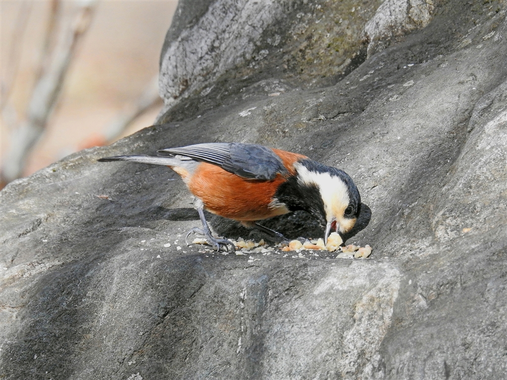 ヤマガラ必死に咥える。このパン屑は、多分鳥撮り屋の仕掛け。山屋はこんなことしない