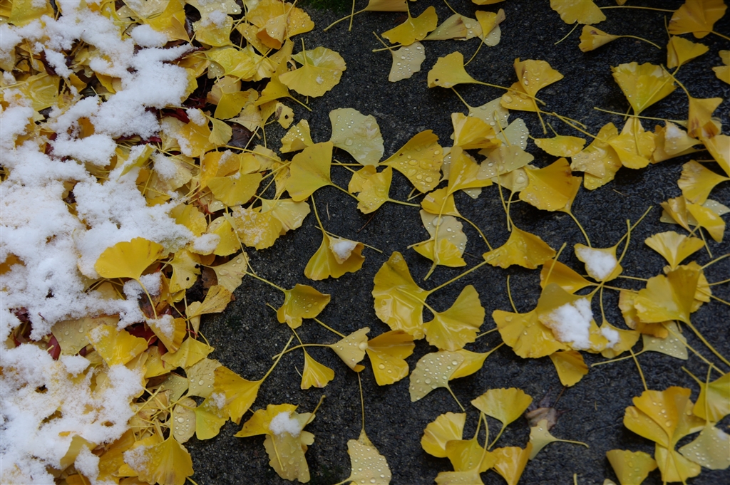 銀杏の落ち葉に雪が降り積みます。 DA18-135mm