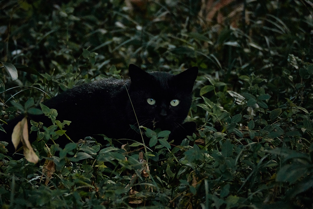 木の下の草むらで、地面に降りる野鳥を密かに待ち伏せする黒猫