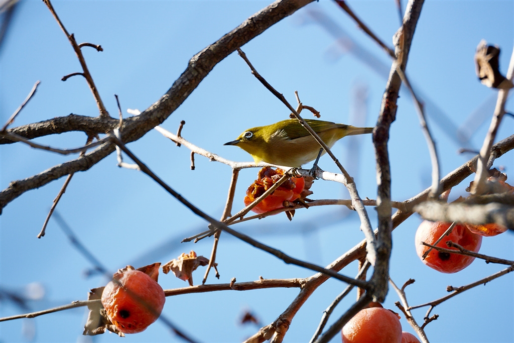 熟し柿を食味するメジロ 渋柿だと鳴き声が悪くなる?!
