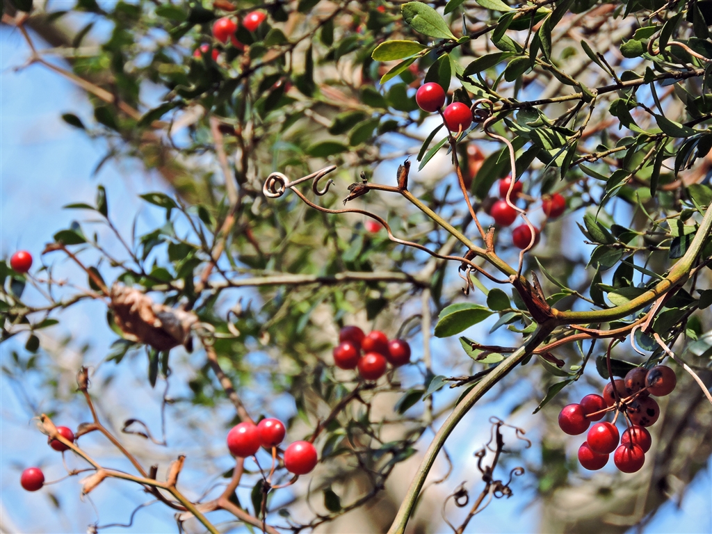 藪漕ぎでの嫌われ物サルトリイバラの実 棘は鋭いが根茎は漢方薬、実はXmasの飾り物