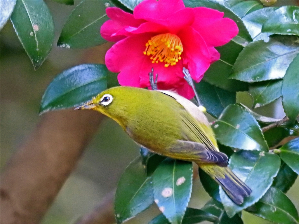 山茶花の蜜も美味い (藪の中が暗く手ブレ、ピンアマご容赦) 換算1600o