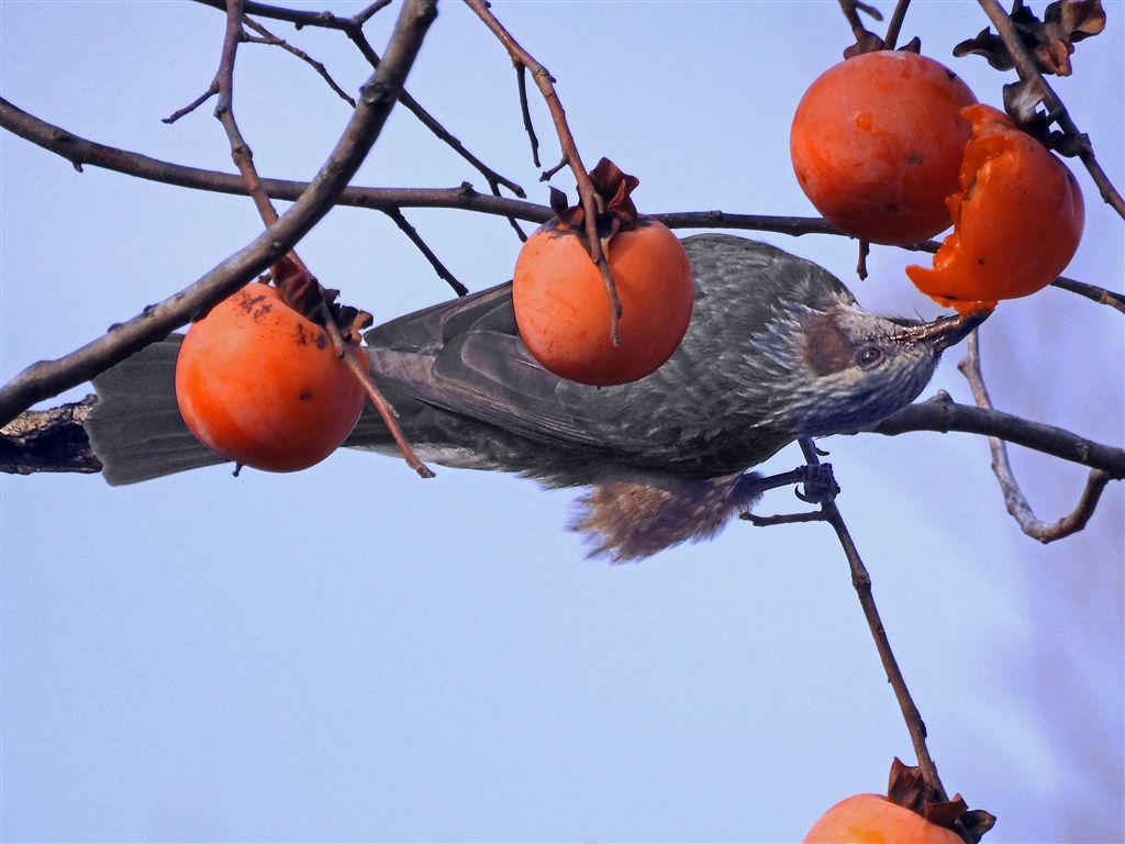 ヒヨドリのこの態度、仰向いて水平になりながらも食っている 換算2000o