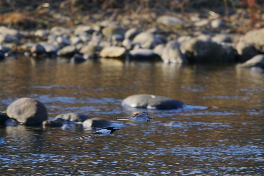 先頭ハクセキレイ続いてセグロセキレイ