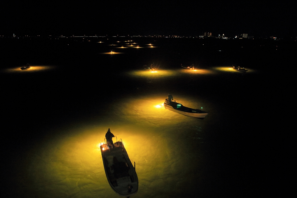 吉野川河口では多いときは40〜50隻もの漁師の船が出る