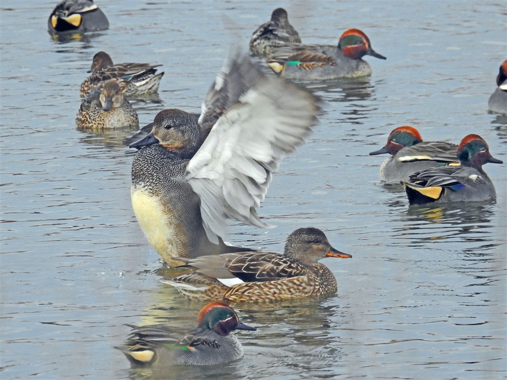 帰途、川にオカヨシガモとコガモ。オカヨシ♂が羽を広げた。車を止め2000oでパチリ