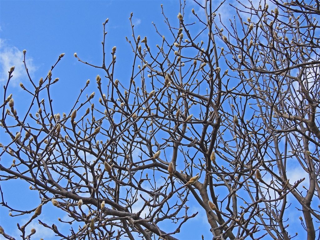 ハクモクレン(白木蓮)の蕾=花芽は上向きで芽鱗(がりん)と呼ばれる毛で保護されている