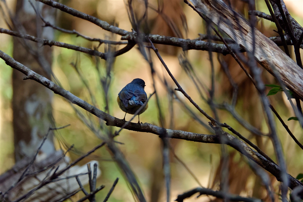 飛び去ったルリビタキが先回りして枝に留まっていた でも周りに邪魔な枝が・・