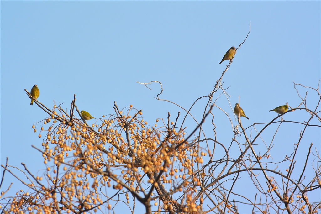 カワラヒワとメジロを順光側で