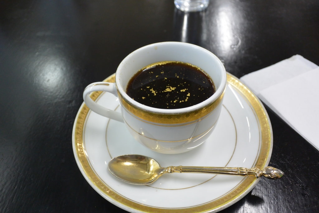 土肥金山の喫茶店の金箔コーヒー420円 味は普通、 チャーハンはやめた方がいいかも