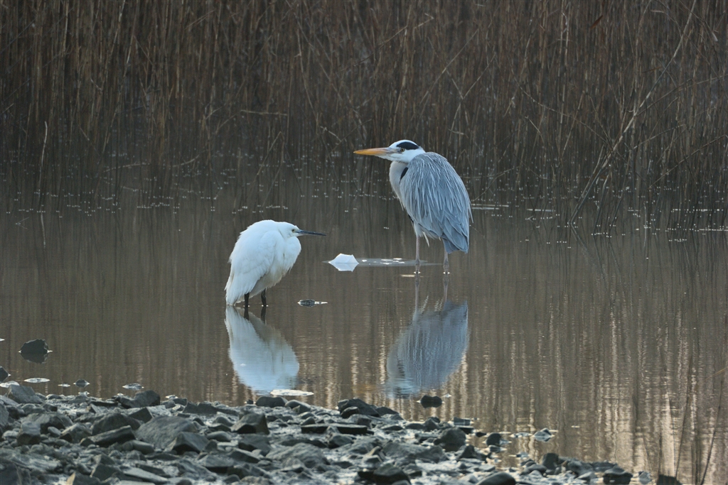 朝早い河川敷にてサギさん同志が仲良く