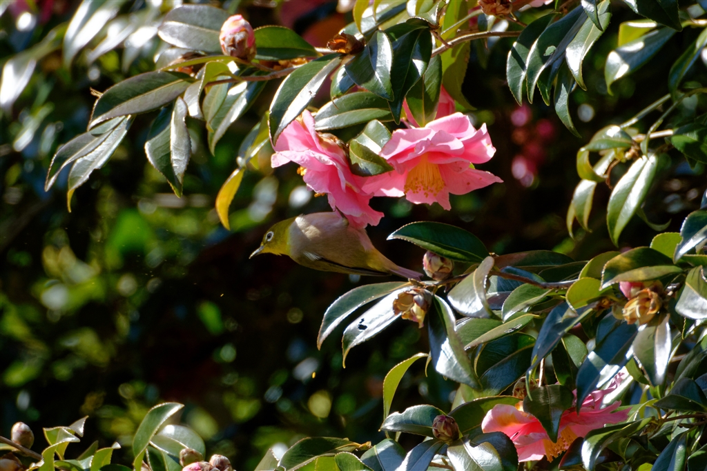 残っているサザンカに来たメジロ(トリミング)三態 2