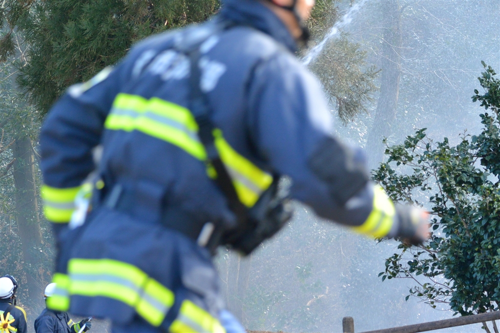 消防士がホースを伸ばし